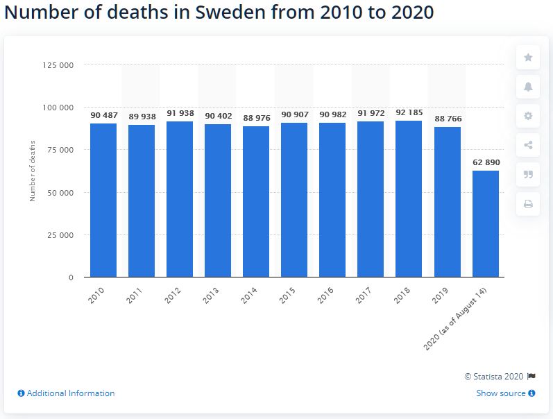 Για δε το επιχείρημα ότι αν δε έπαιρναν αυτά τα μέτρα θα είχαμε περισσότερους θανάτους τα στοιχεία πάλι τους διαψεύδουν. Χώρες όπως η Σουηδία που δεν έκαναν γενικευμένη καραντίνα έχουν τον ίδιο περίπου αριθμό θανάτων από το 2010 εως το 2020!