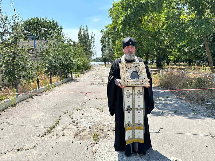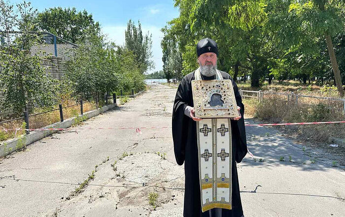 Ο επιχώριος μητροπολίτης της Ορθόδοξης Εκκλησίας της Ουκρανίας μετέφερε χθες μια θαυματουργή εικόνα της Υπεραγίας Θεοτόκου στις όχθες του ποταμού Δνείπερου στη Χερσώνα για να προσευχηθεί για όλους όσοι κινδυνεύουν από πλημμύρες μετά από την καταστροφική έκρηξη στον υδροηλεκτρικό σταθμό Kakhovskaya.