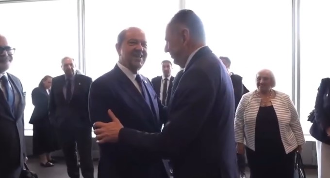 Yunanistan Dışişleri Bakanı Yorgos Yerapetritis, New York’ta yemek öncesinde KKTC Cumhurbaşkanı @ErsinrTatar’ın yanına gelerek tokalaşıyor.