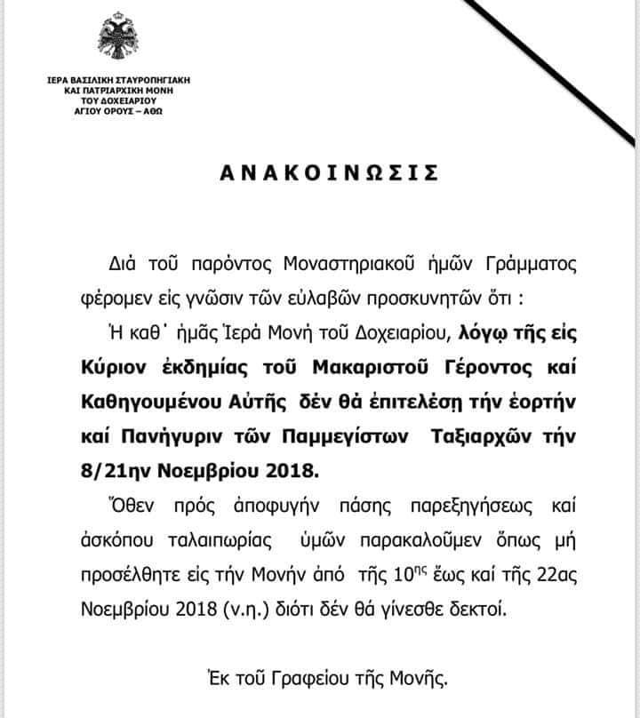 Δεν θα πανηγυρίσει η Ιερά Μονή Δοχειαρίου