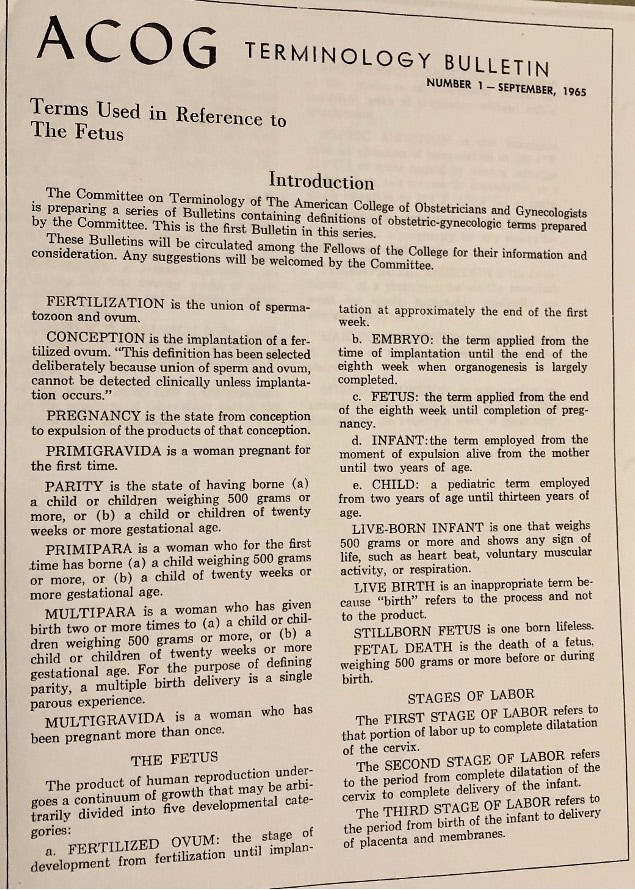 Και όμως, στις αίθουσες συνεδριάσεων του επίσημου ιατρικού κολεγίου των ΗΠΑ πριν από σχεδόν 6 δεκαετίες, εκτυλίχθηκε ένα αξιομνημόνευτο, ίσως και απαίσιο για αρκετούς, σχέδιο. Η πραγματοποίηση του σχεδίου αυτού, οδήγησε το Αμερικανικό Κολλέγιο Μαιευτικής και Γυναικολογίας (ACOG) το 1965, στην έκδοση ενός «Δελτίου ορολογίας: Όροι που χρησιμοποιούνται αναφορικά με το έμβρυο».