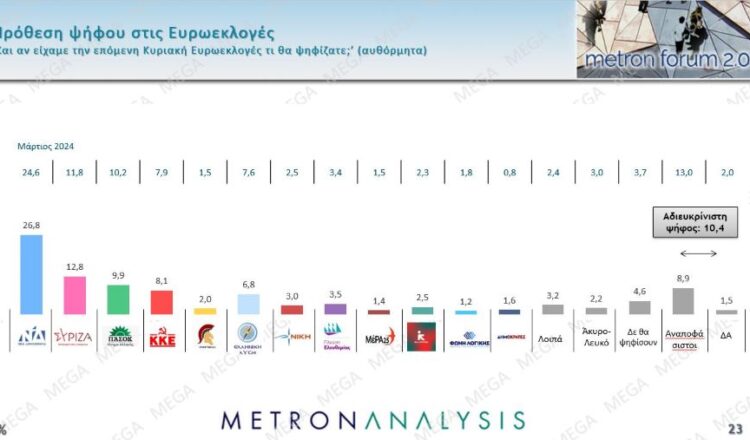 Διαφορετικαὶ ἑταιρεῖαι δημοσκοπήσεων (Prorata, Metron Analysis κ.ἄ.) ἐπιβεβαιώνουν τὴν πτῶσιν τῆς Νέας Δημοκρατίας. Ἂν βεβαίως ὑπῆρχε σοβαρὴ ἀντιπολίτευσις -καὶ φυσικὰ μὲ πρόσβασιν εἰς τὰ μέσα ἐνημερώσεως- ἢ ἔστω συνετοὶ νεοδημοκράται βουλευταί, μετὰ ἀπὸ ὅλα ὅσα ἔχει διαπράξει ὁ κ. Μητσοτάκης δὲν θὰ εὑρίσκετο πλέον εἰς τὴν Ἑλλάδα. Ὡς ἐπληροφορήθημεν ἀπὸ τὴν ἱστοσελίδα «kontranews.gr» τῆς 15ης Ἀπριλίου 2024: