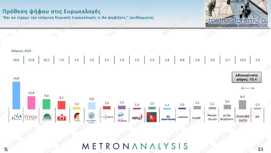 «Σύμφωνα μὲ τὴν ἔρευνα, τὸν σημαντικότερο ρόλο στὴν ἐκλογικὴ προτίμηση ὅσων μετακινήθηκαν ἀπὸ τὸν Ἰούνιο τοῦ 2023 μέχρι σήμερα σὲ κόμμα δεξιὰ τῆς Νέας Δημοκρατίας, ἔπαιξε «ἡ ἀπομάκρυνση τοῦ κόμματος ἀπὸ παραδοσιακές του θέσεις» (60%), ἐνῷ οἱ ἐξελίξεις ποὺ ἐπηρέασαν περισσότερο τοὺς ψηφοφόρους αὐτῆς τῆς κατηγορίας ἦταν: ἡ ψήφιση τοῦ νόμου γιὰ τὰ ὁμόφυλα ζευγάρια (51%), ἡ αὔξηση τῆς ἐγκληματικότητας (34%), ἡ διαχείριση τῆς ὑπόθεσης τῶν Τεμπῶν (31%) καὶ ἡ ἀκρίβεια (24%)».