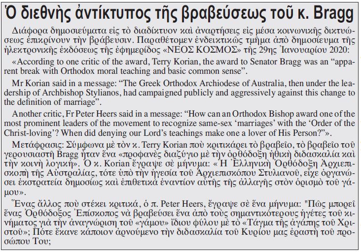 «Μεταξὺ αὐτῶν καὶ ὁ Γερουσιαστὴς τοῦ Φιλελευθέρου Κόμματος τῆς Νέας Νοτίου Οὐαλλίας κ. Andrew Bragg, εἰς τὸν ὁποῖον ὁμοῦ μετὰ τῶν ὑπολοίπων ἀπηύθυνεν εὐχαριστίας. Εἶχε προηγηθῆ, παρόντων ὅλων τῶν Ἀρχιερέων εἰς τὸν Ναὸν (…) ἰδιαιτέρα ὑψηλοτέρα βράβευσις τοῦ κ. Bragg διὰ τοῦ νεοκόπου (ἑτέρου!) μεταλλίου τοῦ «Τάγματος τῆς ἀγάπης τοῦ Χριστοῦ», ὅπου ἀνεκηρύχθη «Ἀνώτερος Ταξιάρχης τοῦ Τάγματος». Ὁ ὄμορφα σμαλτωμένος ἀσημένιος σταυρὸς μὲ στέμμα, ἐπιχρυσωμένος μὲ 24 καράτια χρυσό, φέρων καὶ καλαίσθητον σχεδιασμένον ἀστέρι, τοῦ ἀπονεμήθηκε» μετὰ πάσης τιμῆς καὶ δόξης! Ὡς νὰ μὴ ἔφθανεν αὐτὸ ἔθεσεν αὐτὸν εἰς τὸ δεσποτικὸν παραθρόνιον καὶ ὡς ἄλλος «Ἐρωτόκριτος», ἀφοῦ Κρητικὸς μὲ ποιητικὴν διάθεσιν καὶ αὐτός τοῦ εἶπε ὁ Μακάριος: «Ἀπὸ τὴν πρώτη στιγμὴ ποὺ σᾶς γνώρισα, ἔνιωσα ὅτι εἶστε ἕνα ἄτομο ποὺ πολὺ εὔκολα κερδίζετε τὶς καρδιὲς τῶν ἀνθρώπων…» καὶ τοὺς δημιουργεῖτε ἕνα νέο ἐσωτερικὸ κόσμο»! Τὸ ἀνακοινωθὲν καυχᾶται ὅτι «εἶναι ἡ πρώτη φορὰ ποὺ ἀπονέμεται μία τέτοια ὑψηλὴ διάκριση σὲ μὴ Ἕλληνα καὶ μὴ Ὀρθόδοξο» ἀπὸ τὸν Αὐστραλίας «ποὺ ἔφτασε στὴν πέμπτη ἤπειρο μόλις πρὶν ἀπὸ ἕξι μῆνες»! Ὁποῖον κατόρθωμα ἐντὸς ἕξι μηνῶν! Ὁ προκάτοχός του διατί δὲν ἐβράβευσε κανένα; Εἰς αὐτὰ κατασπαταλοῦνται τὰ χρήματα τῶν Ὁμογενῶν καὶ τοῦ ΥΠΕΞ τῆς Ἑλλάδος δηλ. τῶν φορολογουμένων Ἑλλήνων; Τὸ ἀνακοινωθὲν ὅμως ἀποκρύπτει τὸ πλέον σημαντικόν: ὁ κ. Γερουσιαστὴς ὄχι μόνον δὲν εἶναι Ἕλλην καὶ Ὀρθόδοξος ἀλλὰ ἦτο πρωτοστάτης τῆς μεγάλης ἐκστρατείας διὰ τὴν ὑποστήριξιν τοῦ γάμου τῶν ὁμοφυλοφίλων, ποὺ ἐθεσπίσθη! Τὴν ἐκστρατείαν αὐτὴν εἶχε πολεμήσει ὁ κυρὸς Αὐστραλίας καθηκόντως ὡς ἐναντιουμένης εἰς τὸ Ἱ. Εὐαγγέλιον. Τώρα, ὁ Ἀρχιεπίσκοπος Μακάριος ὄχι μόνον ἀνατρέπει ὅλον τὸν κόπον καὶ τὸν ἀγῶνα, ἀλλὰ ὡς Ἐκκλησία τιμᾶ ἐκεῖνον, ὁ ὁποῖος ἐγκαθιδρύει τὸ κράτος τοῦ διαβόλου, τῆς διαστροφῆς καὶ τῆς ἀνηθικότητος Μόνον διὰ νὰ ἔχη πρόσβασιν εἰς τὴν πολιτικήν; Αὐτὴ εἶναι ἡ τιμὴ πρὸς τὸν Ἅγιον Μακάριον;».