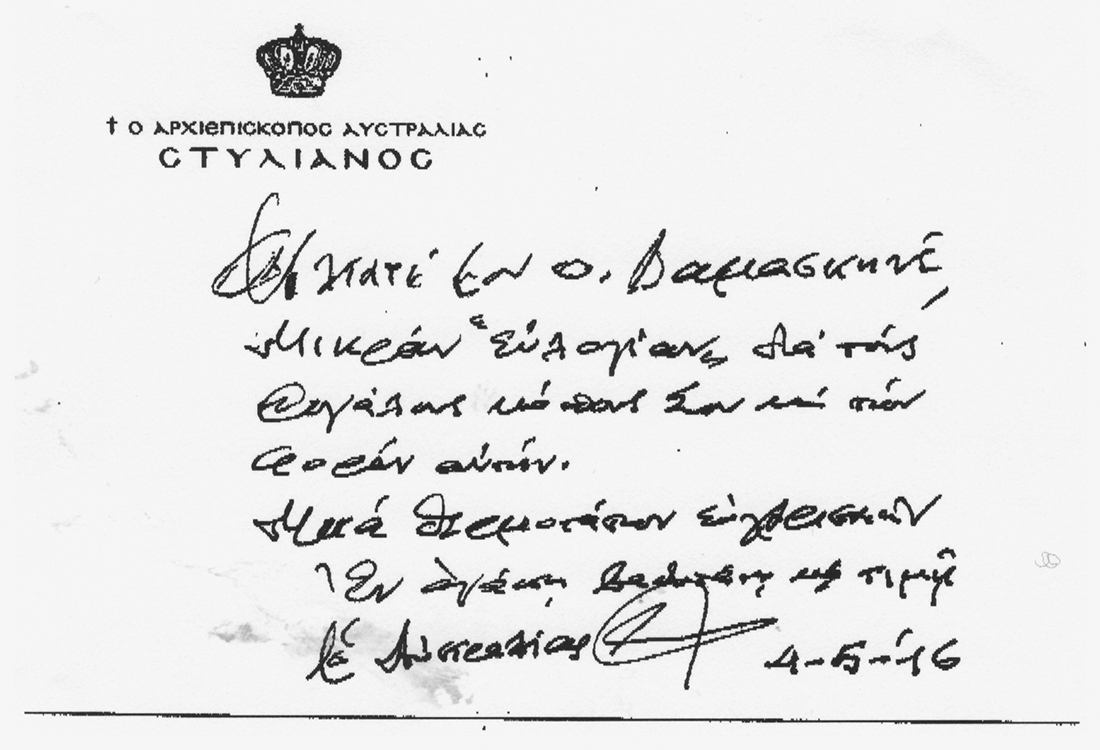 Μία ἐκ τῶν πολλῶν ἰδιοχείρων εὐχαριστηρίων καρτῶν τοῦ Αὐστραλίας κυροῦ Στυλιανοῦ