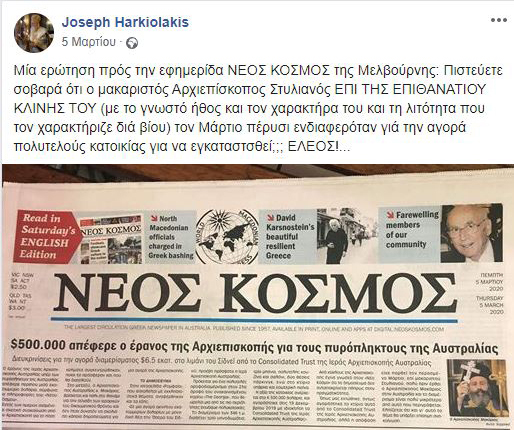 «Τείνω νὰ πιστεύσω ὅτι αἱ φλόγαι ποὺ καίουν ἐπὶ τρίμηνον καὶ ἔχουν ἀφανίσει δισεκατομμύρια δάσους καὶ ζώων εἰς τὴν Αὐστραλίαν, ὅπως δυστυχῶς καὶ ἀνθρωπίνας ζωάς εἶναι ὀλιγώτερον κακὸν ἀπὸ τὴν πνευματικὴν λαίλαπα ποὺ ἐπιφέρει εἰς τὰς ψυχὰς τῶν πιστῶν ὁ Προκαθήμενος τῆς Αὐστραλίας εἰς τὰς χεῖρας τοῦ ὁποίου εἶναι ἡ ὁμογένειά μας»!