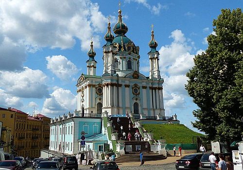 Αριστούργημα της μπαρόκ αρχιτεκτονικής και κτισμένος πάνω σ’ έναν λόφο, ο ναός του Αγίου Ανδρέα με τους τιρκουάζ θόλους θεωρείται ένας από τους ωραιότερους του Κιέβου. Οικοδομήθηκε τον 18ο αιώνα, όταν η Ουκρανία αποτελούσε τμήμα της Ρωσικής Αυτοκρατορίας, πάνω στα σχέδια του γεννημένου στο Παρίσι ιταλού αρχιτέκτονα και διακοσμητή Μπαρτολομέο Φραντσέσκο Ραστρέλι.