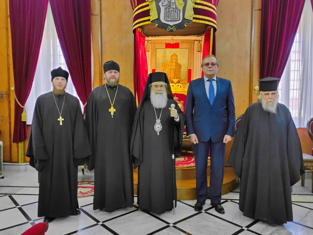 Στη συνάντηση συμμετείχαν ο γραμματέας της Ρωσικής Εκκλησιαστικής Αποστολής στην Ιερουσαλήμ ηγούμενος Νίκων Γκολόφκο και ο ταμίας της Αποστολής ιερομόναχος Αθανάσιος Μπούκιν.