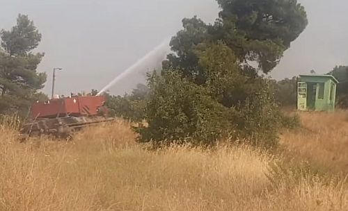 Βίντεο από στρατιωτικό άρμα μάχης που έχει μετασκευαστεί σε πυροσβεστικό και επιχειρεί για την κατάσβεση της πυρκαγιάς.