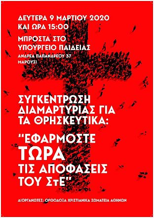 Τα Ορθόδοξα Χριστιανικά Σωματεία των Αθηνών παρακολουθώντας με ανησυχία τη συνεχή και προκλητική αδιαφορία του Υπουργείου Παιδείας να συμμορφωθεί στις ακυρωτικές αποφάσεις του Συμβουλίου της Επικρατείας για τους απαράδεκτους φακέλους των πανθρησκειακών και αντορθόδοξων θρησκευτικών και συμμεριζόμενα την αγωνία των ορθοδόξων γονέων και μαθητών, καλούμε όλους, καθηγητές, γονείς, παιδιά και κάθε συνειδητοποιημένο Έλληνα πολίτη, σε μια συγκέντρωση ειρηνικής διαμαρτυρίας μπροστά στην είσοδο του Υπουργείου Παιδείας, Ανδρέα Παπανδρέου 37, Μαρούσι, τη Δευτέρα, 9 Μαρτίου 2020 και ώρα 3.00 μ.μ.