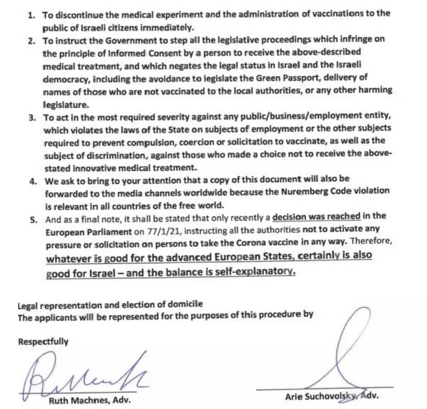 People of Truth κατέθεσε τώρα αγωγή εναντίον της ισραηλινής κυβέρνησης για διεξαγωγή παράνομων πειραμάτων της Pfizer σε ισραηλινούς πολίτες. “Η οργάνωση αποτελείται από δικηγόρους, ιατρούς, ακτιβιστές και διάφορους πολίτες, οι οποίοι αποφάσισαν να διεκδικήσουν το δημοκρατικό τους δικαίωμα, να μη γίνονται αποδέκτες μια πειραματικής φαρμακευτικής αγωγής (εμβόλιο-COVID) και οι οποίοι αισθάνονται, ότι υφίστανται πολύ μεγάλη και βαριά παράνομη πίεση εκ μέρους της ισραηλινής κυβέρνησης.”