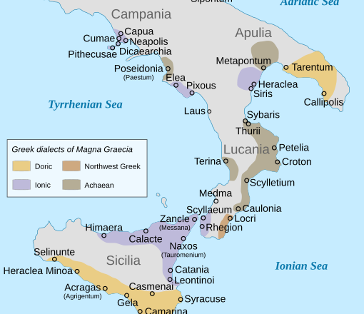 Από τον 8ο έως τον 6ο αιώνα π.Χ., οι αρχαίοι Έλληνες αποίκισαν τη Σικελία και τη νότια Ιταλία. Πρώτοι ήρθαν οι Εύβοιοι, ακολουθούμενοι από τους Κορινθίους και τους Αχαιούς, ενώ οι Αθηναίοι συνέχισαν την επέκταση κατά τον 6ο αιώνα π.Χ. Οι ελληνικοί οικισμοί ήταν τόσο πολλοί ώστε ολόκληρη η περιοχή ονομάστηκε Magna Graecia (Μεγάλη Ελλάδα). Η ονομασία αποδίδεται στον ιστορικό Πολύβιο γύρω στο 150 π.Χ. και καθιερώθηκε αργότερα από τον Στράβωνα και τον Πλίνιο, που είχαν την τάση να χρησιμοποιούν μεγαλόπρεπες εκφράσεις.