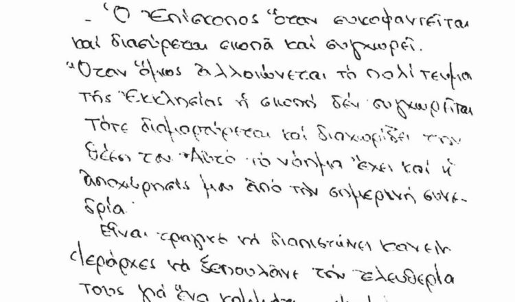 Εἶναι εὐδιάκριτη ἡ ἀβυσσαλέα διαφορά τῶν ἐπιδιώξεων τοῦ Μακαριωτάτου κατά τόν ἐνθρονιστήριο λόγο του, σέ συνάρτηση μέ τίς πράξεις του τῶν τελευταίων μηνῶν. Ἐτόνιζε τότε στόν ἐπίλογό του: «Προσεύχομαι και παρακαλώ τον Θεό, όταν περάσει ο καιρός και πλησιάζω στο τέλος του κύκλου της επίγειας διακονίας μου να είμαι έτοιμος να απολογηθώ με παρρησία ενώπιον Θεού και ανθρώπων γι’ αυτόν τον θρόνο που μου εμπιστεύτηκε ο Κύριος».